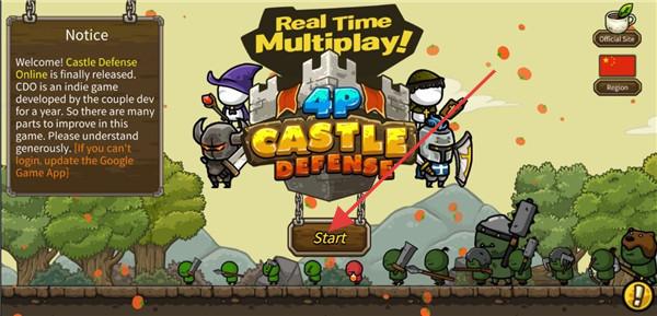 1、游戏启动界面,显示“4P CASTLE DEFENSE”,支持实时多人玩法,点击“Start”开始游戏,有官方博客、语言(Chinese)等入口。