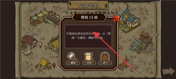 3、公会地图界面,展示“商城15级”信息,可增加玩家战后代币获取(修复级增加,满级20%),有“建造”“历史”“进入”操作。