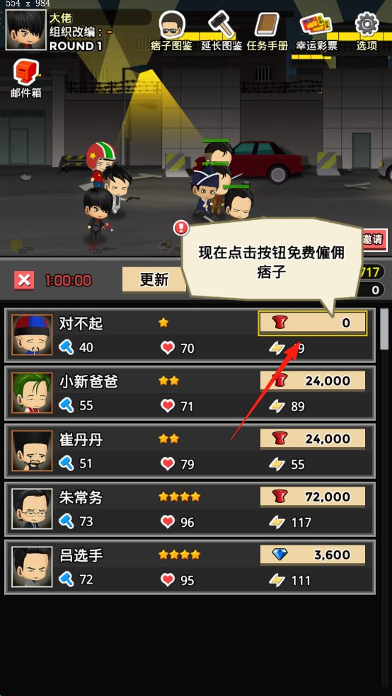 1、点击按钮,雇佣痞子,搭配阵容,参与战斗,推进组织改编进程。