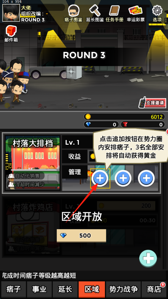 2、进入区域界面,点击追加,安排痞子,管理产业,获取黄金收益。
