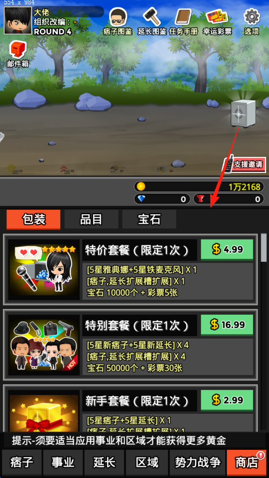 3、打开商店,选购套餐,获得痞子、道具,强化实力,助力发展。