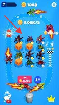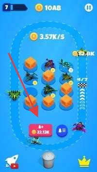 1、点击红色按钮,合并或升级飞机,提升金币每秒获取速度。