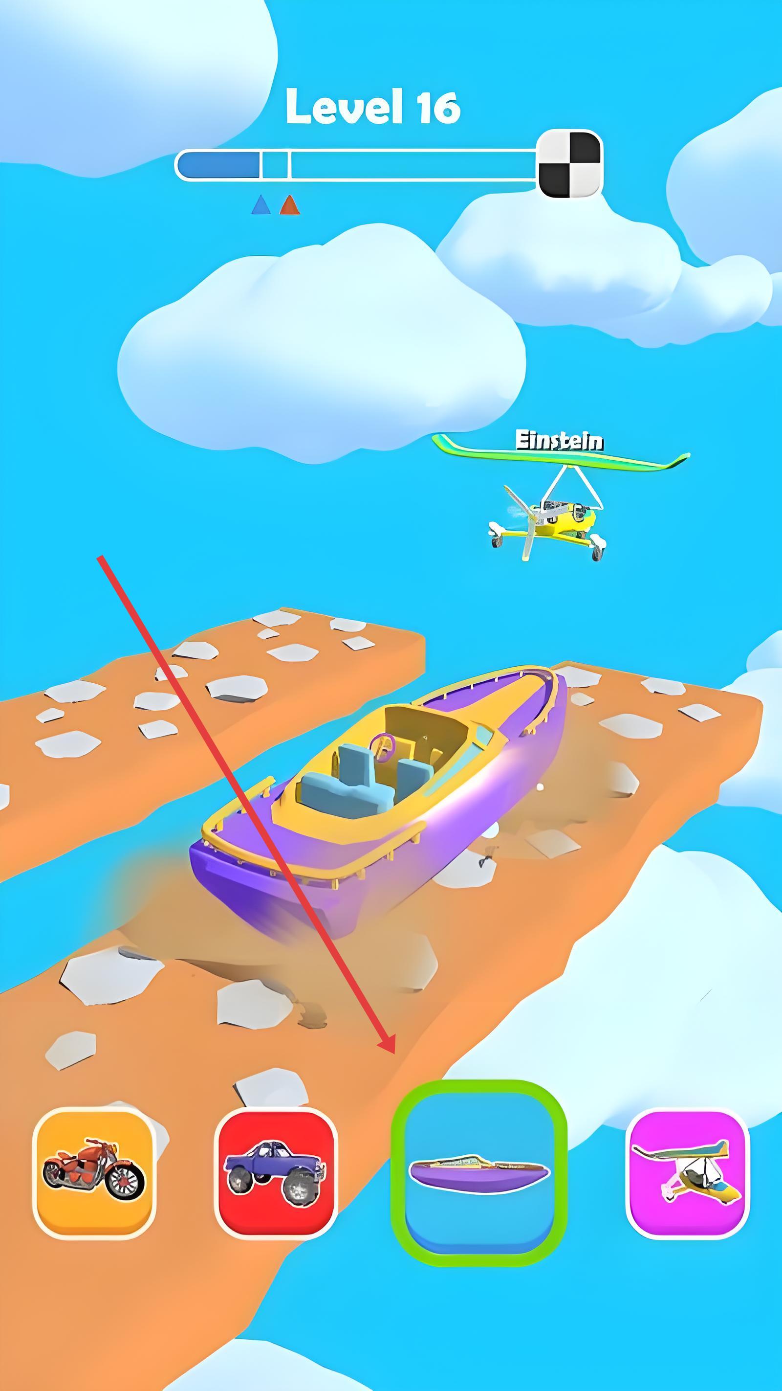2、行驶中注意实时路况变化,遇到积水路段及时切换快艇,雪地路段更换防滑轮胎,通过滑动屏幕操控方向躲避障碍物。