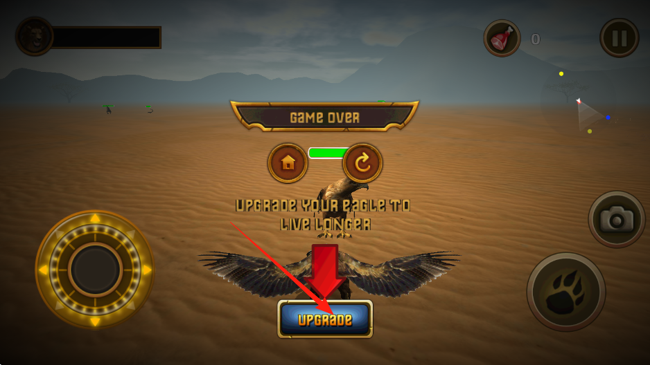 3、失败后,选择升级飞鹰,提升能力,再次进入场景,挑战更高难度。