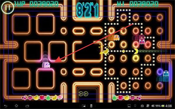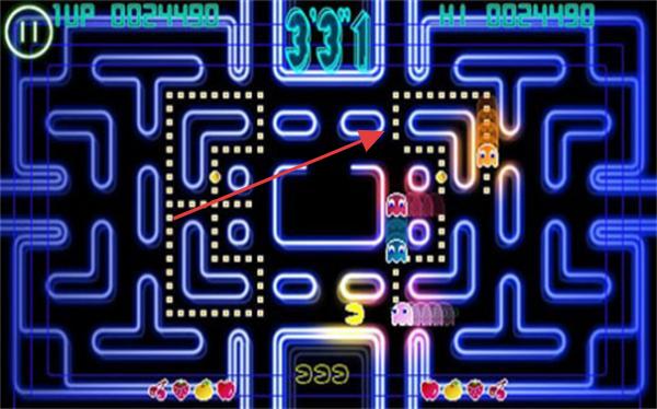 2、在迷宫地图,引导吃豆人躲避幽灵,吃掉豆子、水果等道具,获取分数,推进游戏进程。