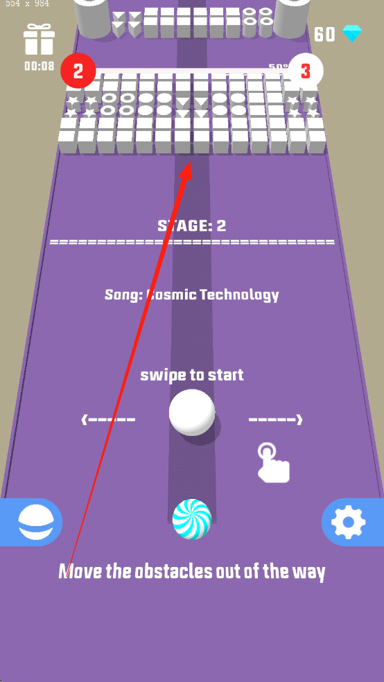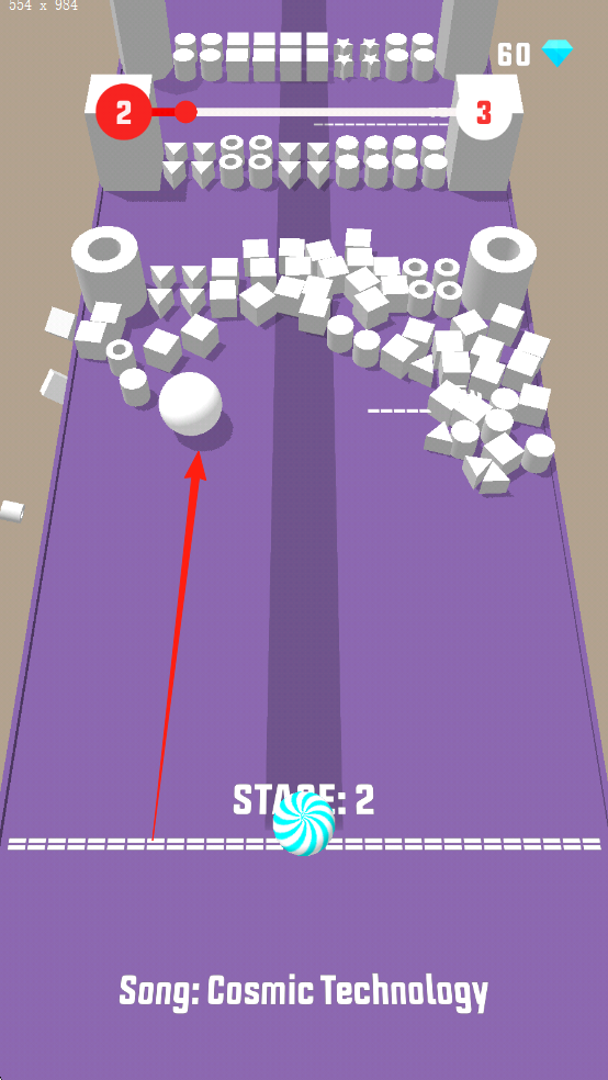 1、优先观察赛道物体颜色分布,预判移动轨迹,通过滑动屏幕控制小球转向,精准碰撞相同颜色物体,避开异色障碍物。