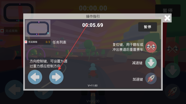 3、在游戏过程中,利用方向控制键(或重力感应)、加速减速键操作卡丁车,完成规定圈数,留意复位键应对突发状况。