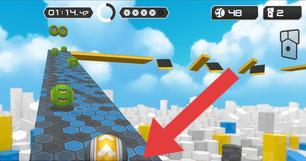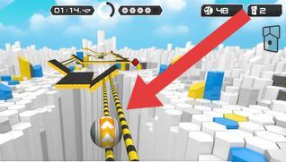 2、引导滚球在黄黑条纹轨道移动,关注轨道转折与落差,借助冲刺机制突破复杂路段挑战。