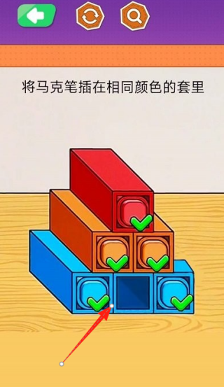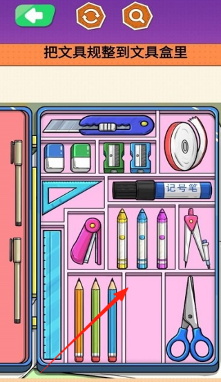 2、进入美术教室关卡,快速区分荧光色系与基础色系马克笔,同时留意带刻度型号笔的特殊摆放要求。