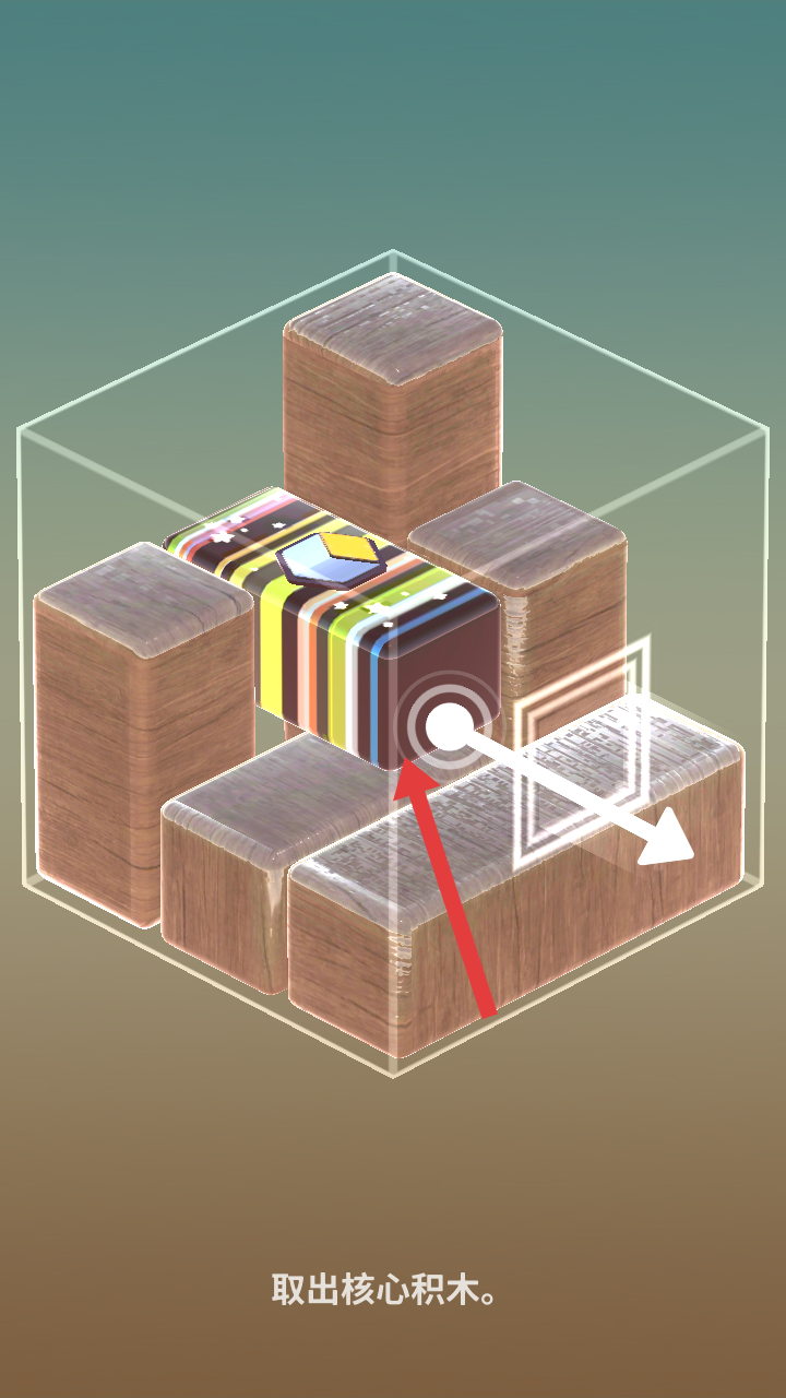 2、需要在游戏中按系统的提示操作,点击彩色核心积木并拖动,尝试从包围的木块中取出它。