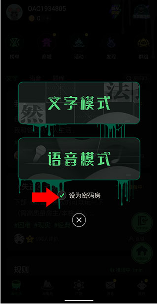 2、选择文字或者语音模式,此时可勾选为密码房。