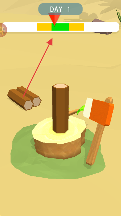 2、观察上方进度条,在绿色区域时点击,完成砍树获取木材。