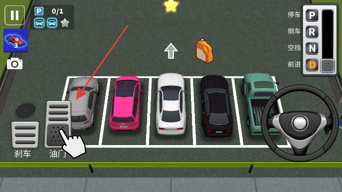 2、操作左侧“油门”“刹车”、右侧方向盘,操控车辆驶出车位。