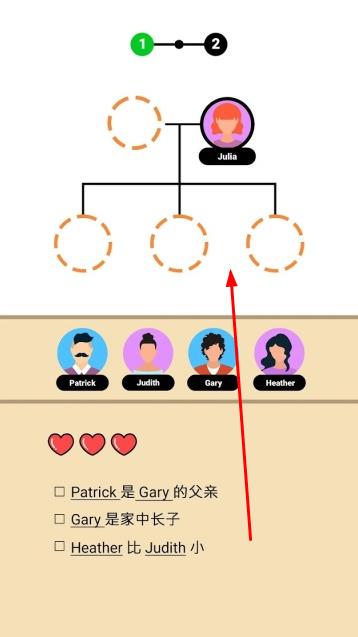 1、进入家族树,从初始关卡开始,仔细研读文字描述的人物关系线索,在树状图界面选择合适位置放置首位人物。
