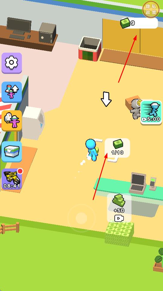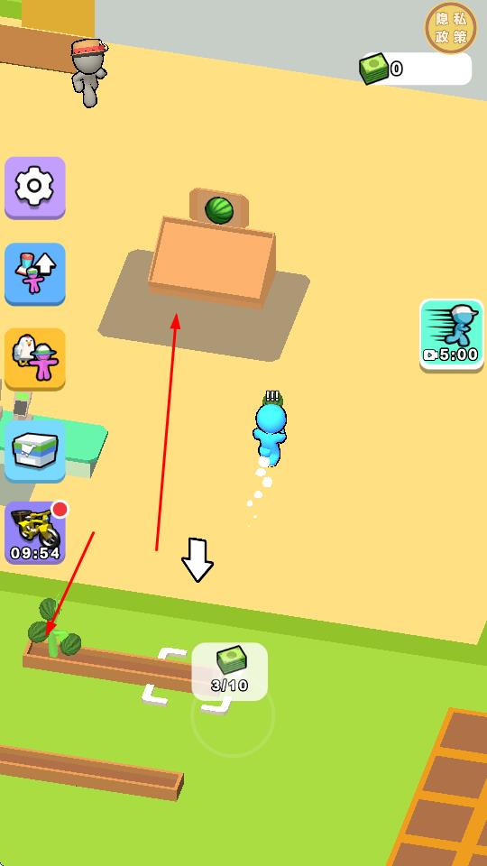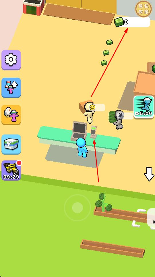 2、将收获的商品搬运到摊位、收银台,与顾客NPC交易,完成售卖流程,获取金币。