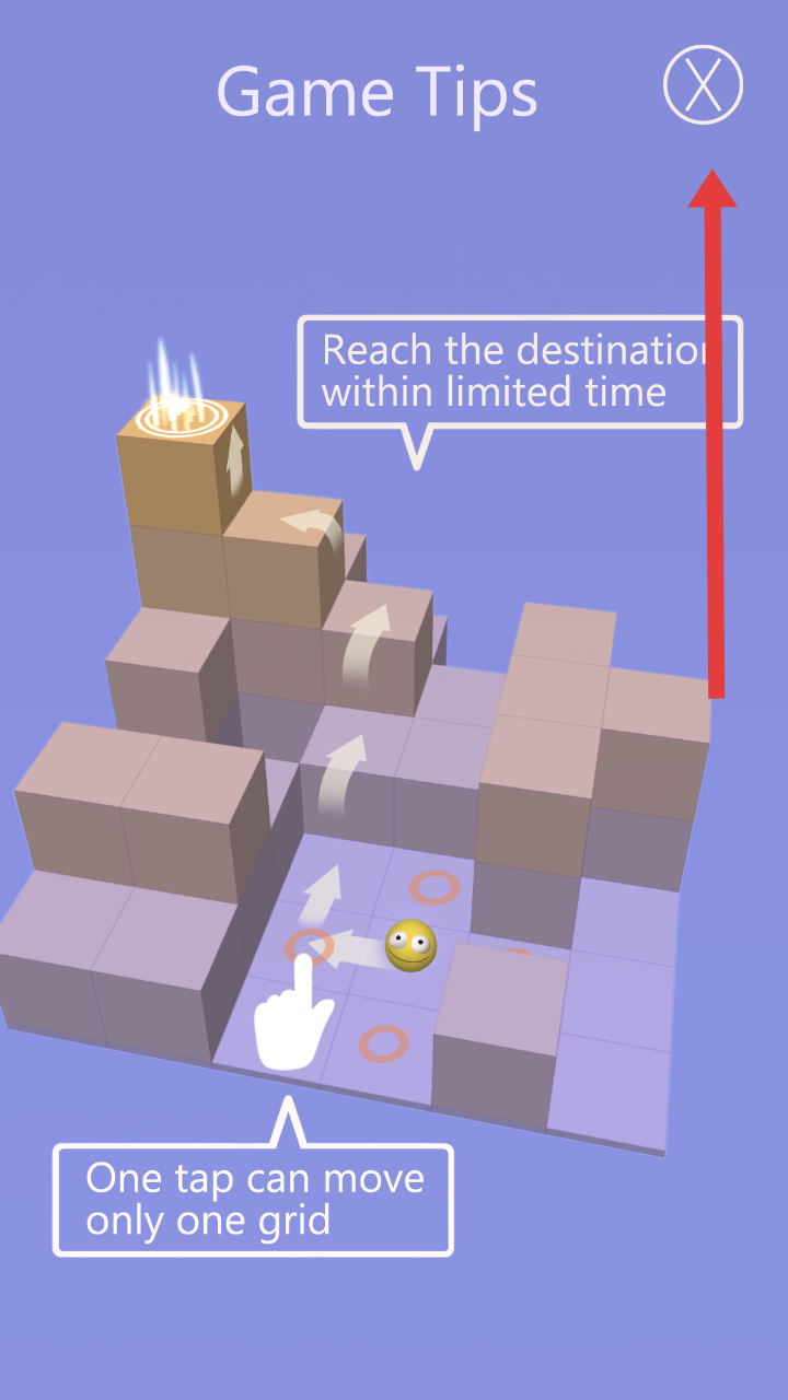 1、游戏开局查看提示,明确【点击一格移动一步】规则,需在限时内抵达发光终点,开启闯关。