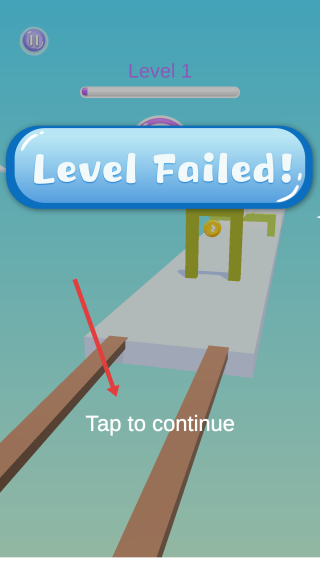 3、失败/重试:若软胶球掉落轨道缝隙,触发“Level Failed”,点击“Tap to continue”重新挑战关卡。