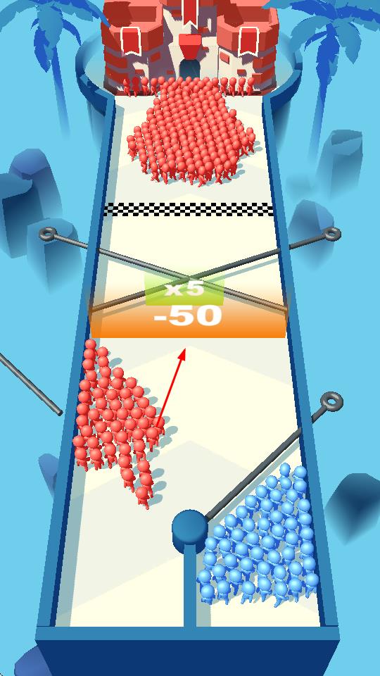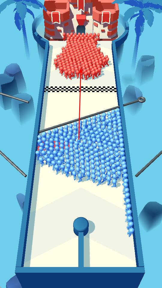 人群别针是一款将物理碰撞与策略规划巧妙结合的休闲竞技游戏,玩家通过操控场景中的别针方向,引导自动奔跑的人群穿越重重陷阱与增益区域,最终在终点集结足够数量的小人击败对手,以极简的视觉风格、富有创意的玩法机制和紧张刺激的竞技体验,为玩家带来全新的策略挑战。