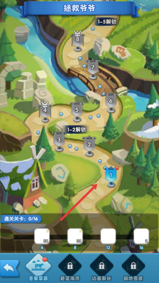 1、关卡选择:进入“拯救爷爷”地图,选关卡1,开启冒险。