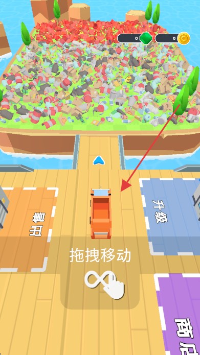 1、拖拽橙色卡车,进入垃圾堆积的岛屿区域。