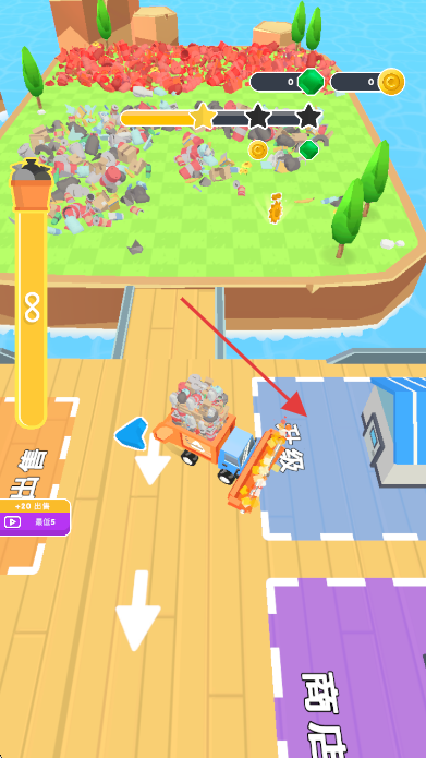 3、满载垃圾后,将卡车开至右侧“升级”区域,卸载垃圾,完成清理任务。