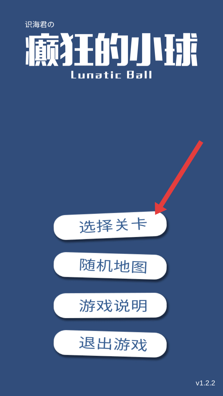 1、进入癫狂的小球的游戏主界面,操控者需要点击【选择关卡】,进入关卡选择页面开启冒险。