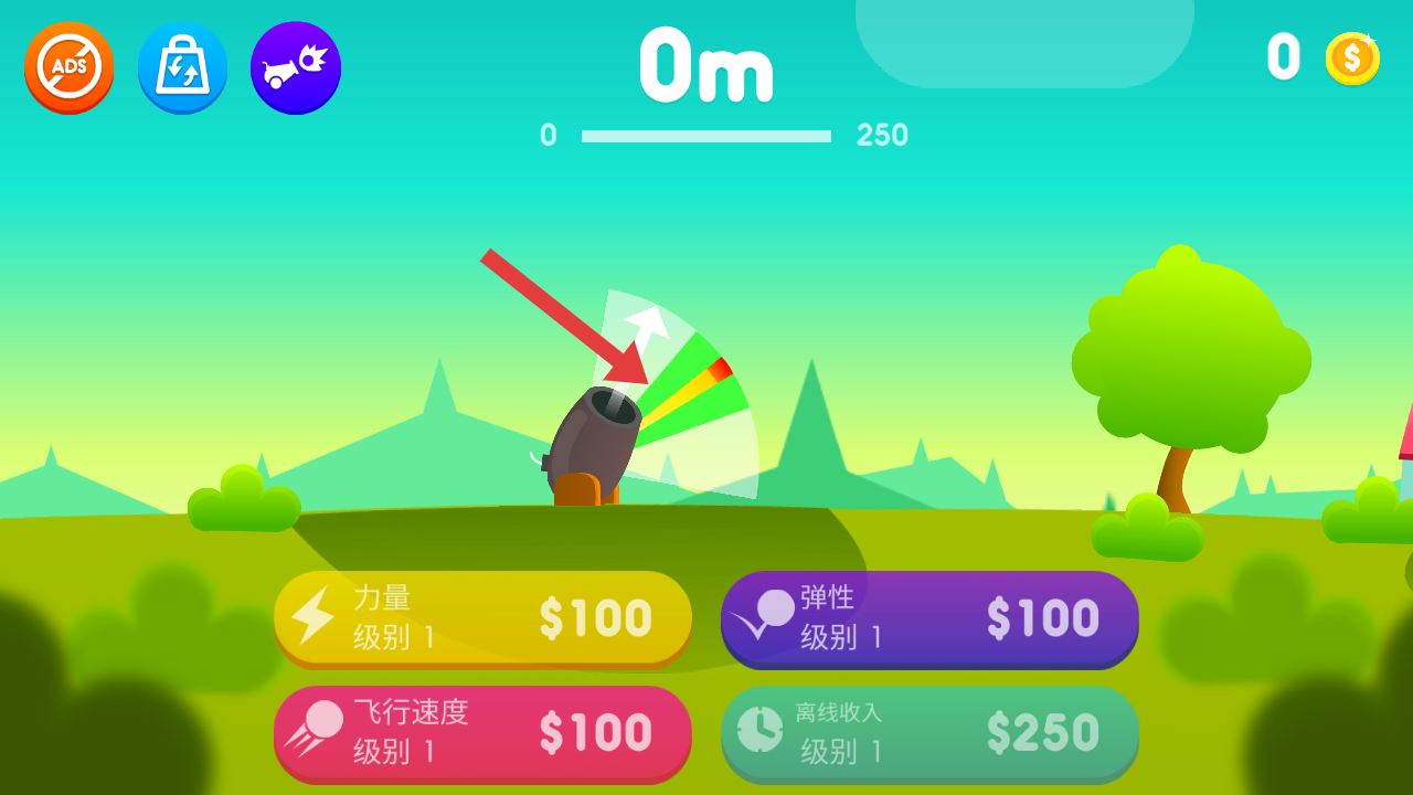 1、当游戏开局,调整炮台发射角度,可花费金币升级【力量】【弹性】等属性,为发射物体做准备。