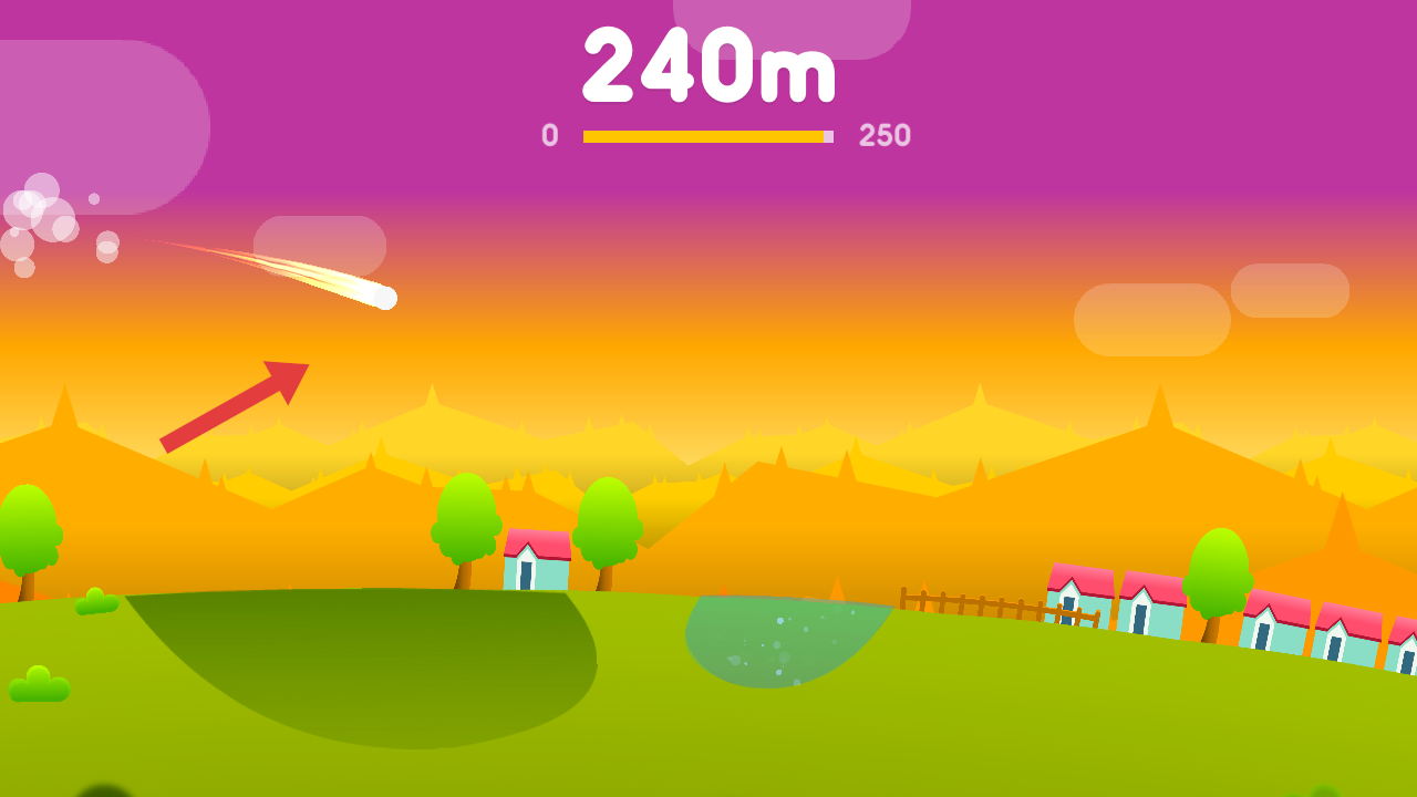 2、炮台发射后,物体沿轨迹飞行,借助场景地形维持飞行,朝着更远距离目标推进,突破关卡进度。