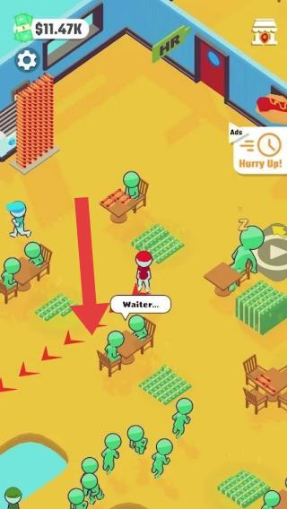3、呈现披萨店经营场景,有资金显示($11.47K)、角色(顾客、服务员等),还有“Waiter...”(服务员相关需求),属于店铺运营、顾客服务的环节。