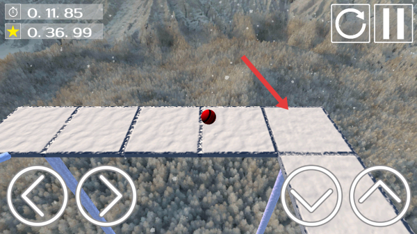 3、在冰雪场景中,操控红色球体沿平台前进,利用界面按钮控制移动方向,注意保持平衡以顺利推进。