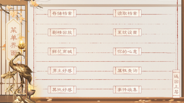 3、用【存储档案】【读取档案】管理进度,【剧情回放】重温情节;借【鲜花商城】购道具,【男主好感】【其他好感】了解关系,【属性查询】【事件收集】辅助游玩,优化体验。