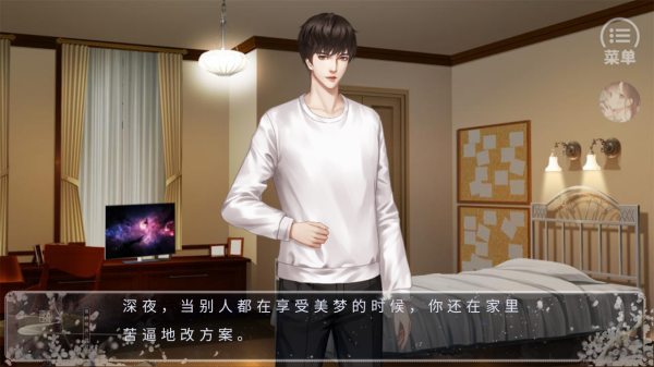 2、跟随剧情文本 “深夜,当别人都在享受美梦的时候,你还在家里苦逼地改方案”,互动推进主线发展。