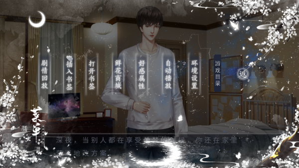 3、用【剧情回放】重温情节,【插入 / 打开书签】管理进度,【环境设置】调参数;借【好感属性】【鲜花商城】优化体验,【自动播放】便捷推进,【游戏目录】查看设定。