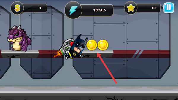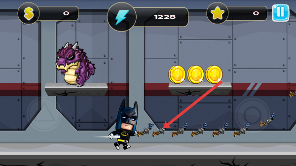 2、跑酷游戏中,操控蝙蝠侠角色,沿箭头方向移动,收集金币,注意避开紫色怪兽等障碍,积累资源。