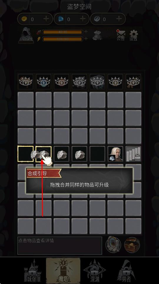 1、在背包界面,拖拽合并相同物品,触发合成升级,提升道具属性、功能,助力冒险进程。
