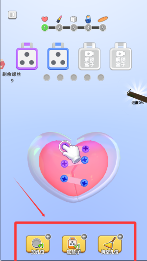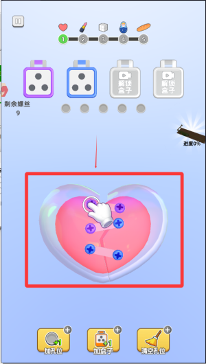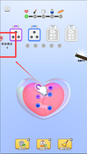 2、仔细观察物品表面螺丝的颜色分布,寻找与上方盒子颜色相匹配的螺丝,按照提示顺序点击旋转将其拧下,注意观察特殊标记。