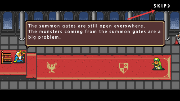 1、剧情推进:开场有剧情对话(召唤之门、怪物问题),可点“SKIP”跳过,进入玩法选择。