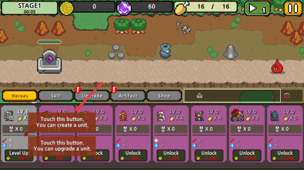 3、战斗准备:在英雄界面,点击按钮创建单位、升级英雄,配置战力,应对关卡敌人,推进游戏。