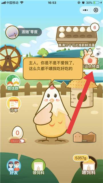 1、进入游戏主界面,点击【幸运大转盘】,消耗鸡蛋参与抽奖,有机会获得饲料、鸡蛋等奖励。