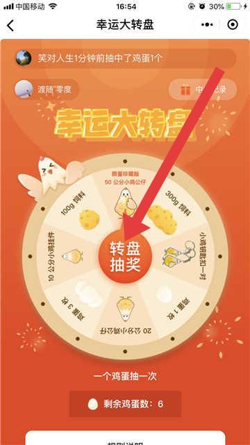 2、在幸运大转盘页,点击【转盘抽奖】,消耗1个鸡蛋转动转盘,尝试获取小鸡、饲料等福利。