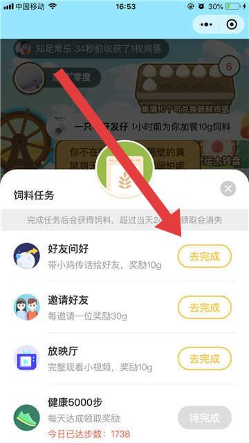 3、查看饲料任务,选“好友问好”等任务,点击【去完成】,完成后领取饲料,用于喂养小鸡。
