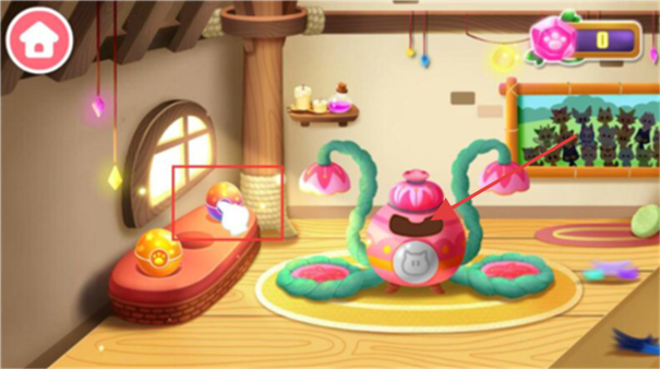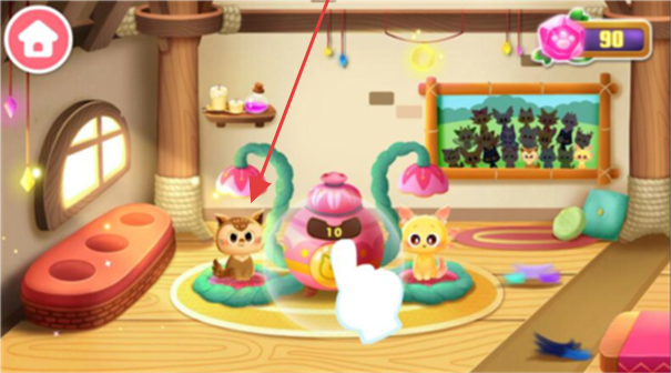 1、进入游戏,点击主界面互动元素(如彩蛋、茶壶),开启猫咪养成互动。