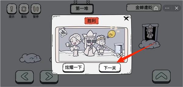1、完成关卡,选择下一关,进入新场景,点击提示,解开难题,推进进程。