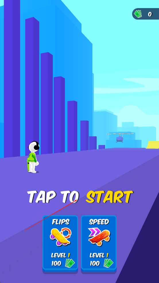 1、进入游戏后在角色界面选择火柴人造型与滑板类型,滑动屏幕操控滑板在起点加速,准备进入充满敌人的关卡场景。
