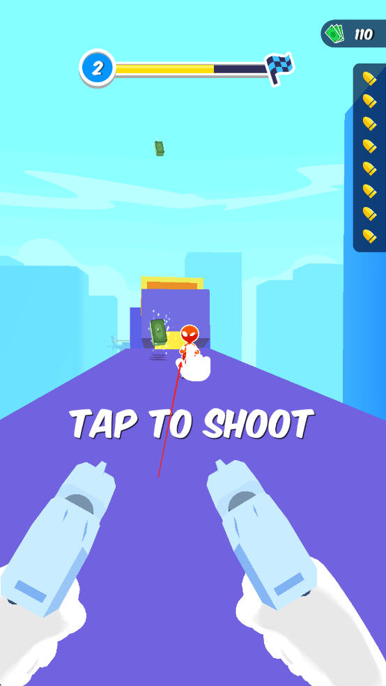 2、滑板过程中点击屏幕右侧发射子弹攻击敌人,左滑右滑完成躲避动作,长按屏幕可让火柴人做出空中翻转等高难度滑板特技。
