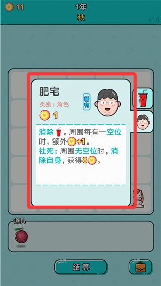 2、肥宅,周围没有空位的时候,可以消除自身,获得八个金币。