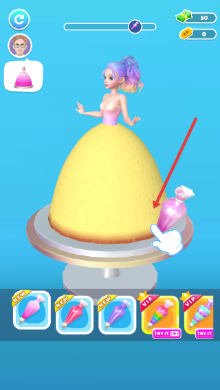 3、装饰操作:选择装饰道具(如粉色挤花袋),对基础模型(黄色半球)进行装扮,还原/创作目标造型,推进制作流程。