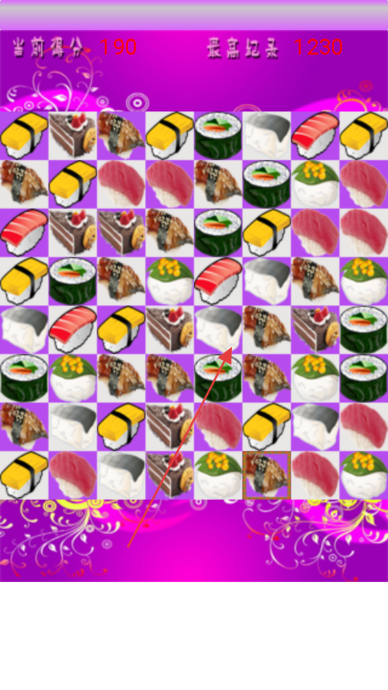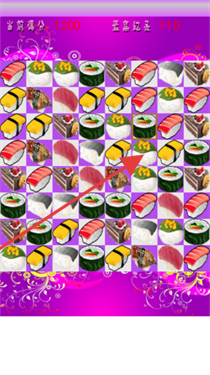 2、连线相同寿司完成消除,每消除一组获对应分数,持续操作积累当前得分。
