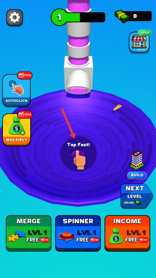 1、开局操作:进入游戏,按“Tap Fast!”提示快速点击紫色区域,收集基础资源(如钱币)。