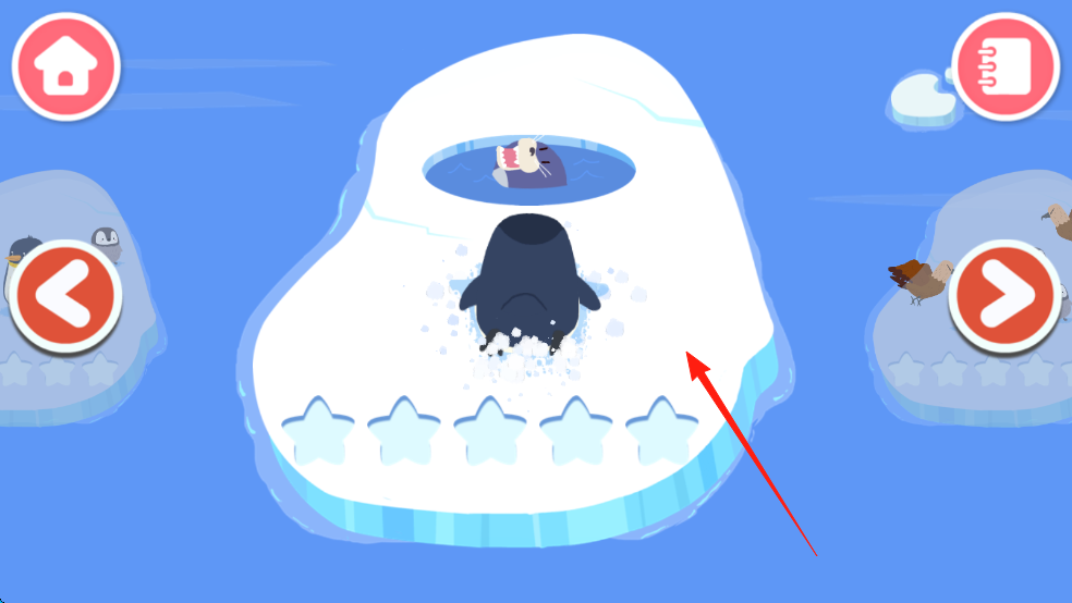 1、点击企鹅,使其在冰面移动,避开障碍,前往指定区域,完成任务。